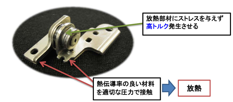 ヒンジ(蝶板)に熱伝導のよい材料を組合せ、本体から外部(液晶モニター等)へ熱を逃がし、本体の温度上昇を防止する機構を備え、熱に弱いCPU等を有する製品の保護を実現
